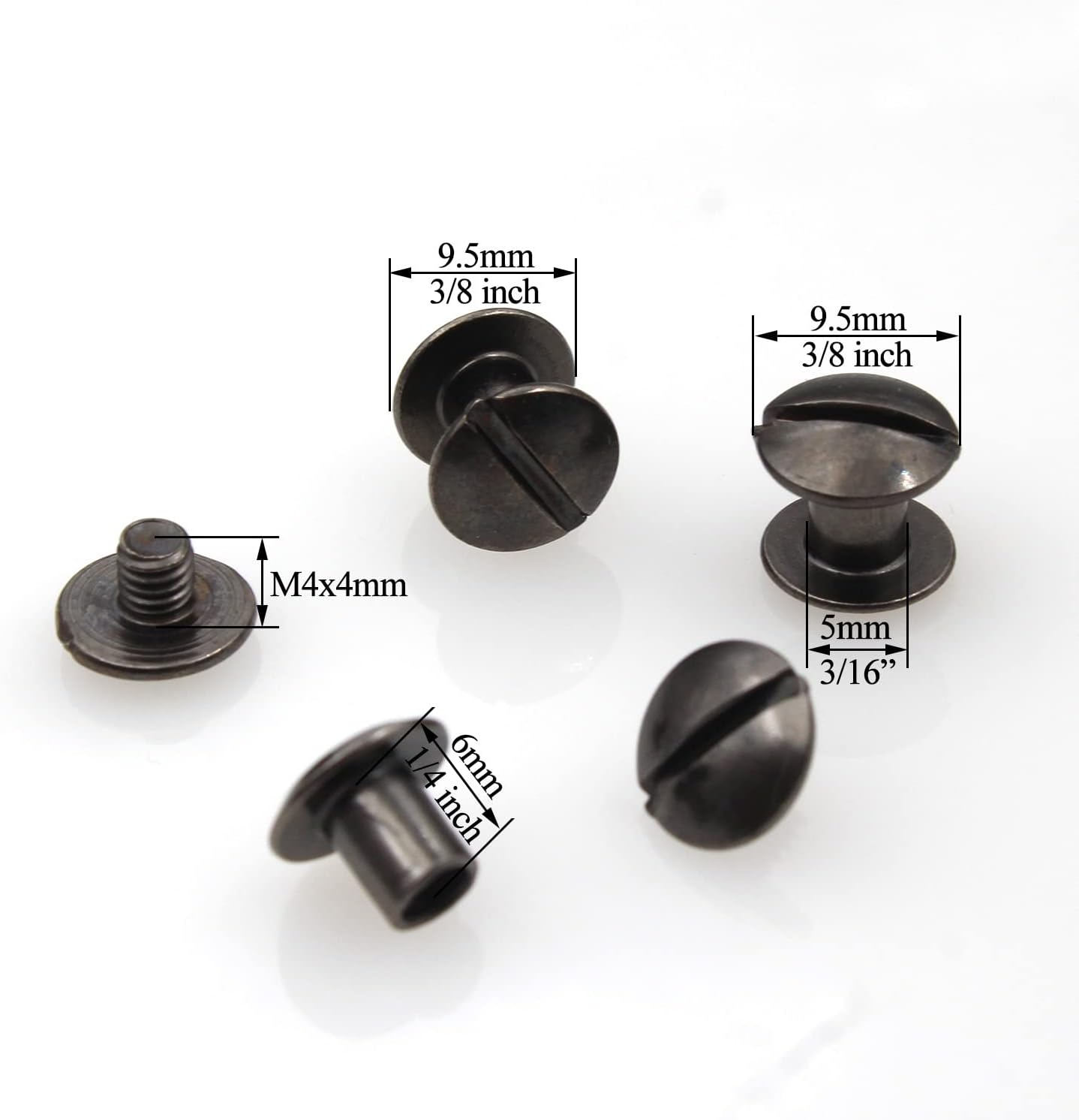 material: These Chicago screws are made of carbon steel, advanced nickel plating, and a stable and dense oxide film on the surface, which is durable and anti-rust. The finish is smooth with fine outline, the screw heads has no burr, the slots are low profile, can be easy to remove and install. Storage box: Reusable storage boxes: All the binding screws packed in a delicate and transparent box. You can easily take it out and use it when you need it. Wide range of uses: especially suitable for various leather crafts such as belts, handbags, leather shoes, binding documents, books, photo albums, DIY crafts. You can use it as you like. Specification: Size:5x6mm( 3/16"x1/4"),(Each set of screws includes 2 parts, a pillar and a cross nail) Tips:contains small parts, keep away from children.