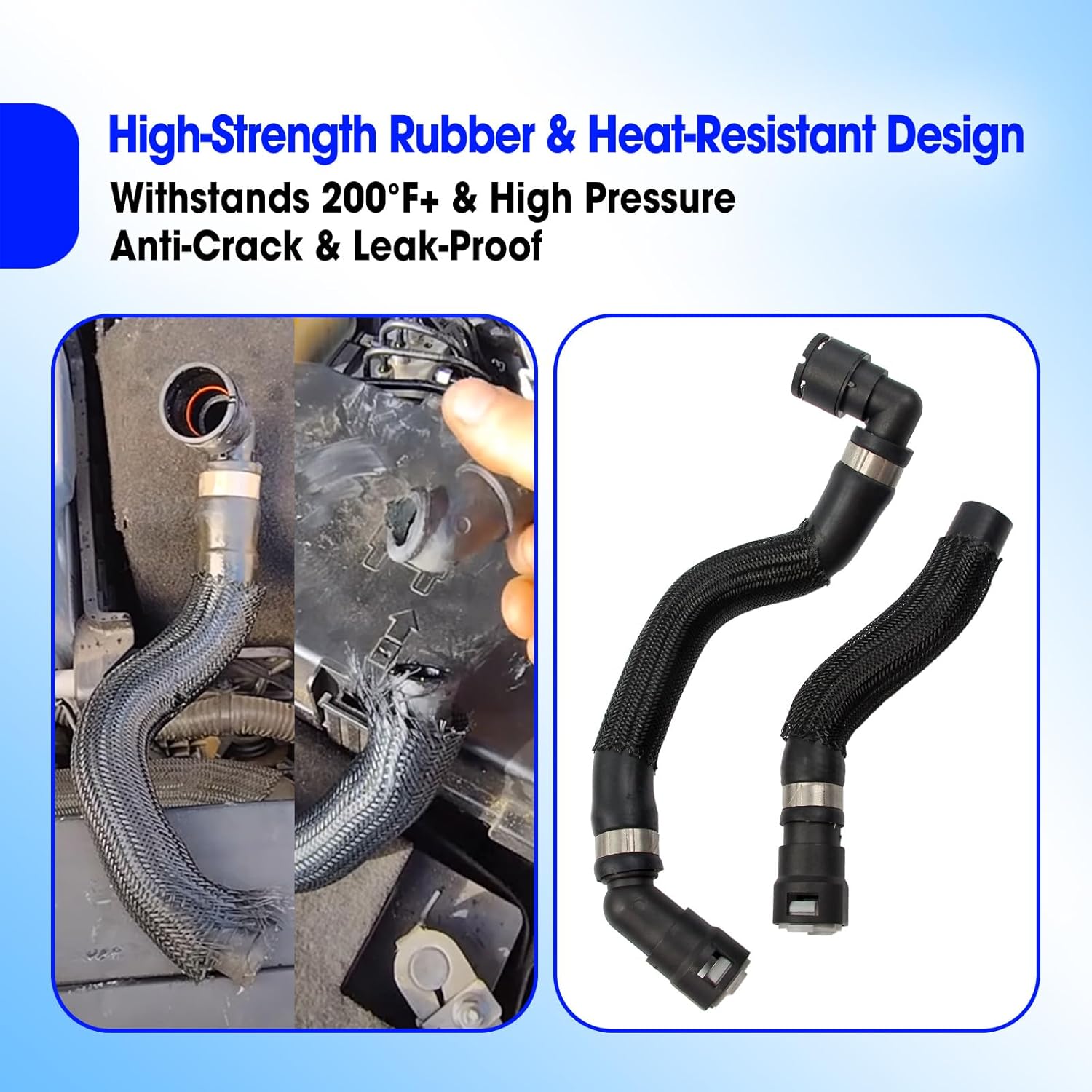 Compatible Models Fit for Jeep Grand Cherokee 2.4L 2014 2015 2016 2017 2018 Fit for Chrysler 200 2.4L 2015 2016 2017 Repalce Part Number Replace 68199254AB 68199254AA 68104972AA 52014624AA 68192082AA 52014627AB Premium Construction for Long-Lasting Performance --Crafted from high-strength rubber and heat-resistant materials, these hoses are built to endure extreme temperatures and pressure fluctuations within your vehicle's HVAC system --The durable construction prevents cracking, leaks, and premature aging, ensuring reliable performance and an extended service life even under demanding conditions Optimized Heating & Air Conditioning Efficiency --A precision-engineered, tight-seal design minimizes air leakage, maximizing heat transfer efficiency for faster and more consistent cabin warming --Whether you're facing freezing winter mornings or relying on your defroster for visibility, this hose set helps restore your vehicle's heating functionality, ensuring a comfortable and safe driving experience Complete 4-Piece Kit for Easy Replacement --This set includes all four essential hoses (supply and return air ducts), allowing you to replace multiple components at once --This all-in-one solution saves time, reduces installation complexity, and ensures system-wide compatibility for smoother maintenance