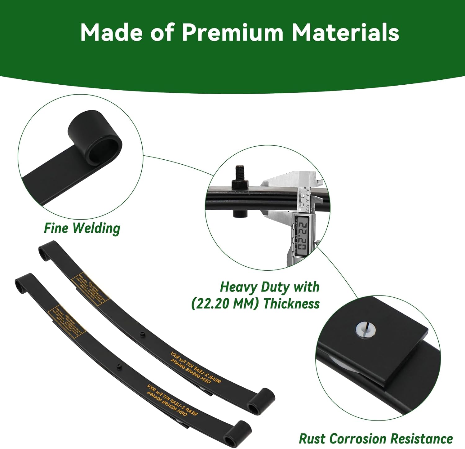 | Included Components | 1 × User Manual, 2 × EZGO RXV Heavy Duty Rear Leaf Springs #603498 (Gas) / #604494 (Electric), 2 × U-Bolt #603415, 4 × Lock Nut #600025, 4 × Large Polyurethane Bushing #620160, 4 × Small Polyurethane Bushing #70291-G01, 4 × Seamless Metal Sleeves #620161 |