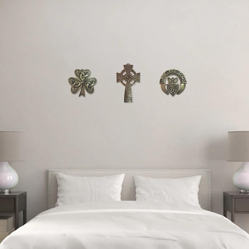 Give your household a cultural makeover with these meaningful wall plaques. Our set of three is plated with antique looking and sturdy Bronze, an alloy metal that guarantees luster and resistance over time. Our pieces have the dimensions of approximately 15 cm in Width and 15 cm in Height and are large enough to be displayed on any wall. The decorations include a wide variety of Celtic and Irish symbols such as the Shamrock, High Cross, Claddagh Ring and various Knotworks. Bring Ireland closer to you with this antique set of three wall plaques.