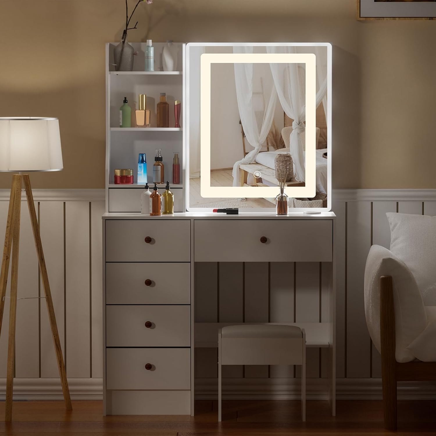 It's time to look your best! This white makeup vanity was created for this purpose and it will be your right hand for beauty. It's a wonderful perfect gifts for friends, girls, women, wife on special day, such as birthday, valentine's day, mother's day, Christmas and so on.What will you get?--Dressing table with drawers--Stool with cushion--Installation manual (electronic version available)--12 months warrantyProduct Parameters.Product Name: Make-up VanityMaterial: MDF, GlassVanity size: 90x78x40cmStool size: 12.6''H x 8.6''D x 14.2''WApplicable scenes: Bedroom, Dressing Room, Makeup RoomApplicable Audience: Girls and WomenRecommended number of installers: 2 adultsNote:1. A screwdriver is included, but if an electric screwdriver is used, the installation process will be less laborious and faster.2. Please install and tighten the reinforcing screws (screw package marked B), which will help the dresser to fit firmly together.3. Packages weigh up to 42 pounds and are recommended for mechanical handling or multi-person handling.4. If you have any questions during use, please feel free to contact us, and we will solve your problems with Amazon